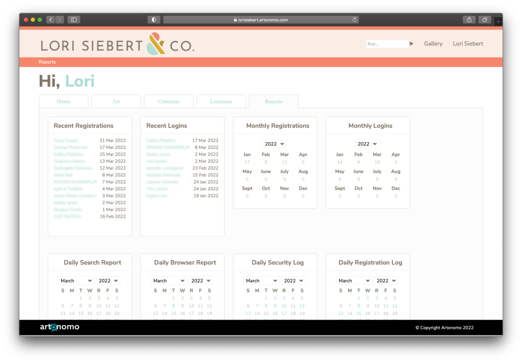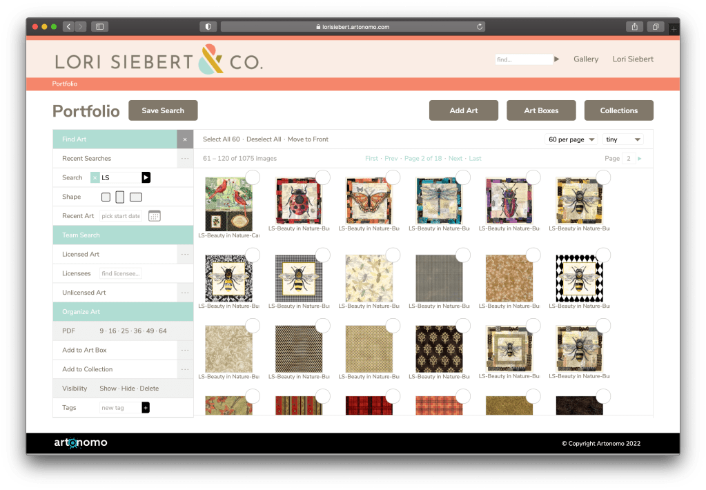 Artonomo eliminates the need to gather and process art into PDFs to send to manufacturers and licensees. That saves me time and allows me to get back to painting and creating. There are features on my dashboard that allow me to track who is logging in and and what artwork they are viewing most.