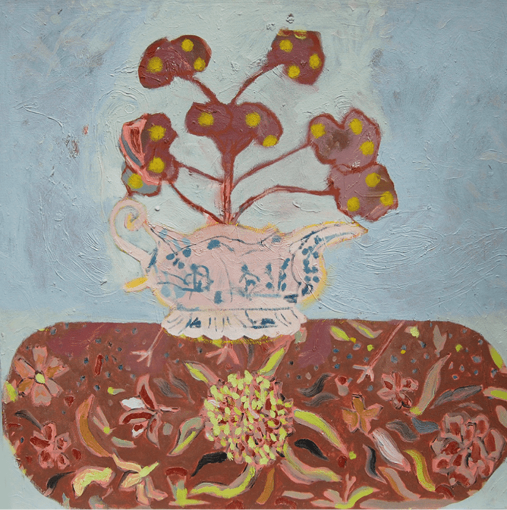 She has designed ceramics for Anthropologie in the past. Her paintings are flat, stripped of all perspective or realism, their surfaces hazy and meandering like an old tale retold a thousand times. Roughly rendered yet delicately arranged, she creates patterned compositions reminiscent of old tapestries, into which she plants naïve pre-Modern motifs. Outlines of old figures, ancient heralds, esoteric herbs and familiar animals all appear like inherited objects worn smooth by the touch of innumerable hands.