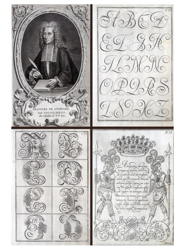 Portuguese penman of the 17th century, 1670-1722. Some say 1670–1735. Andrade de Figueiredo was born in Espirito Santo, where his father was Governor of the Capitania. His work follows the style of the great Italian masters in its use of clubbed ascenders and descenders, and of Diaz Morante, the famous Spanish writing master, in its very elaborate show of command of hand.