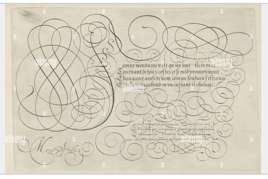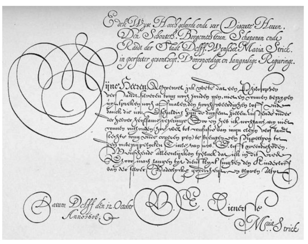 Maria Strick was highly esteemed during her life, being awarded the second prize in the prestigious Plume du couronnée writing contest, held in The Hague in 1620. In particular, her skills in the Italian hand were unequalled. Apart from the four known writing manuals, which established her reputation, she made calligraphic captions for art prints, and several handwritten specimens have survived.