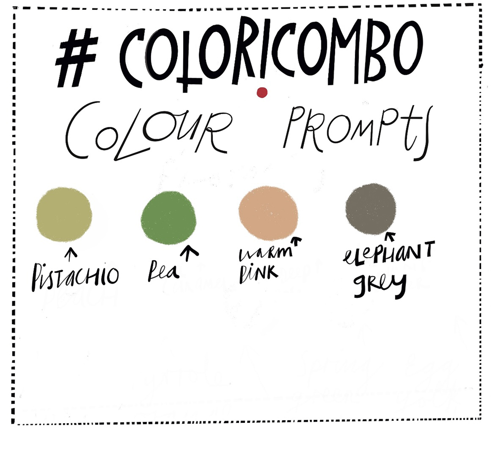 The color palette: Pistachio, Pea, Warm Pink, Elephant Grey