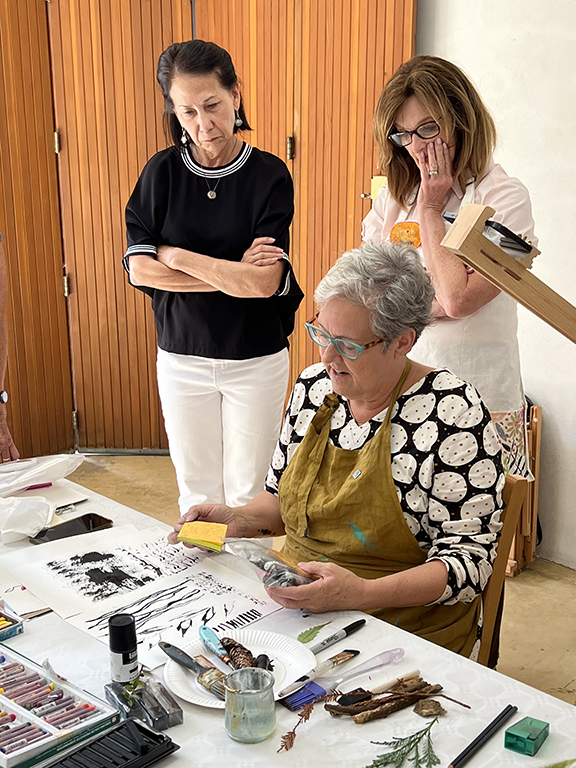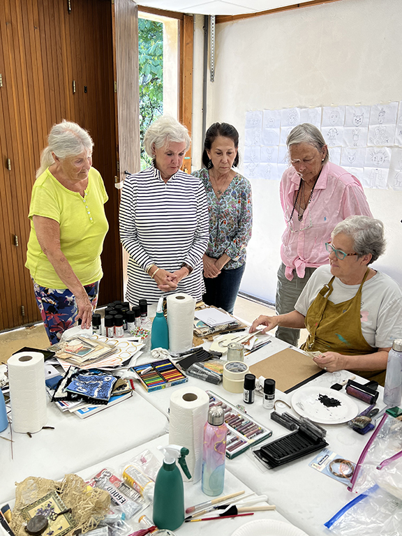 Afterwards, we headed back and got to play in the studio. My teaching style is to share prompts and exercises that allow the personalities and interests of each individual to come through in the works. I LOVE when the unique style of each person shows in what is created during my retreats!! There was a range of art making experience in our group, which I really like. We had a newly retired woman who was an accountant and had never really made art. We also had women who have been in product development for years, but looking to try new techniques and ideas. It was a wonderful group!! We laughed a ton, we danced to Aretha and we became life long friends while creating amazing art!