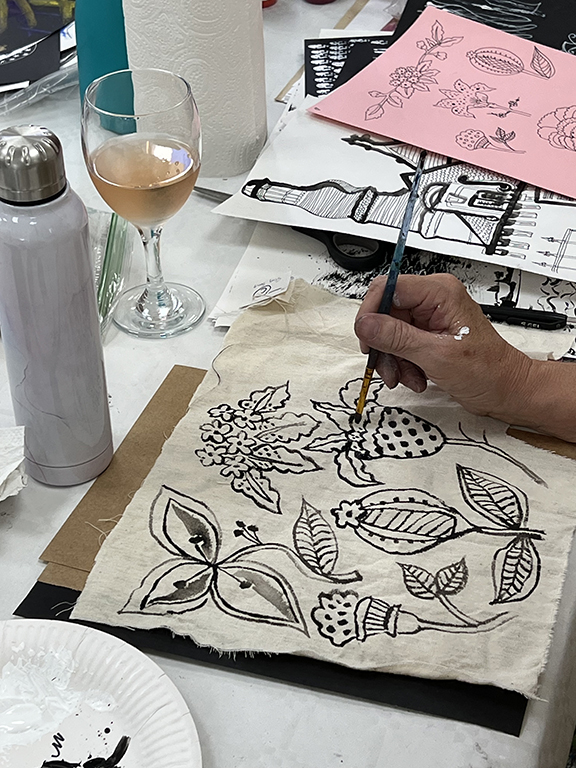 We arose each day and headed out to the most spectacular adventures in neighboring villages. I assigned a fun creative scavenger hunt for our daily jaunts. We looked for inspiration for varieties of line, shape, color, texture and pattern to be incorporated into the art we made during our studio time together. After filling our creative buckets to the brim every morning, we enjoyed the most delicious picnics. A beautiful lunch magically unfolded of homemade quiche, unique salads, bread… and of course… wine… served on the side of a lovely river or park.