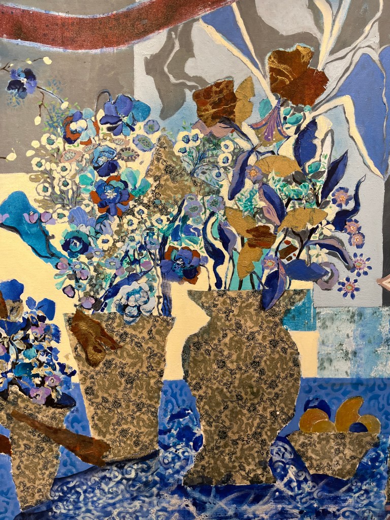 Nature plays a pivotal role in her work and is emphasized by the use of organic shapes and non-saturated colours. Her paintings and collages are made using a combination of watercolour and cut paper elements, drawing on 17th century botanical prints and folk art.