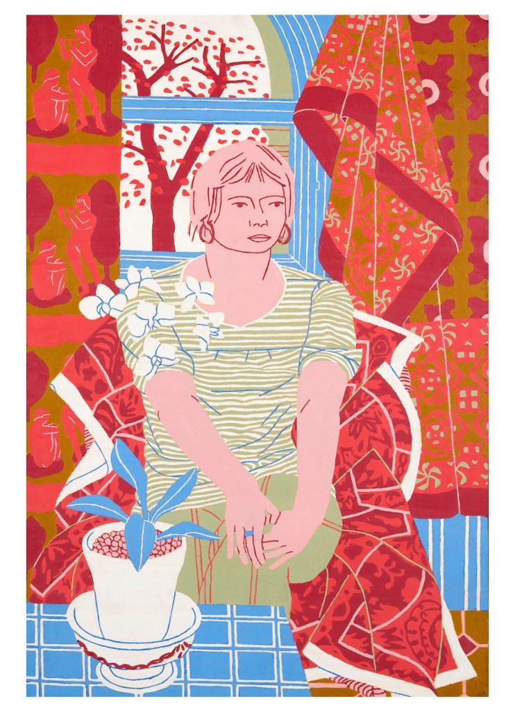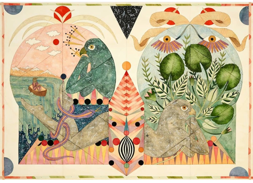 Her paintings are flat, stripped of all perspective or realism, their surfaces hazy and meandering like an old tale retold a thousand times. Roughly rendered yet delicately arranged, she creates patterned compositions reminiscent of old tapestries, into which she plants naïve pre-Modern motifs. Outlines of old figures, ancient heralds, esoteric herbs and familiar animals all appear like inherited objects worn smooth by the touch of innumerable hands.