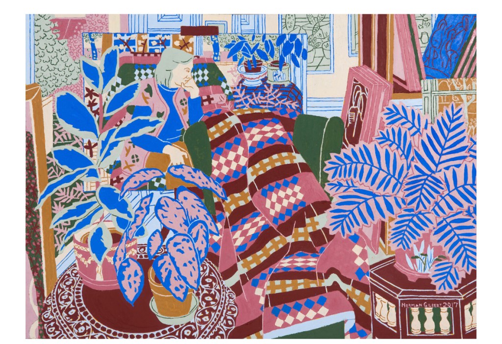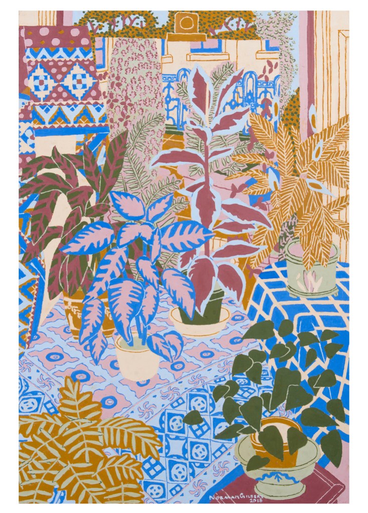 Norman Gilbert (b.1926 Trinidad – d. 2019 Scotland) was one of those special artists who found a distinct immediately identifiable visual language. With it he describes a life and its embraces, quiet domestic afternoons seeped in a patchwork of pattern, colour and memories.