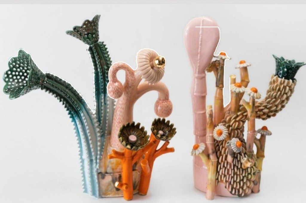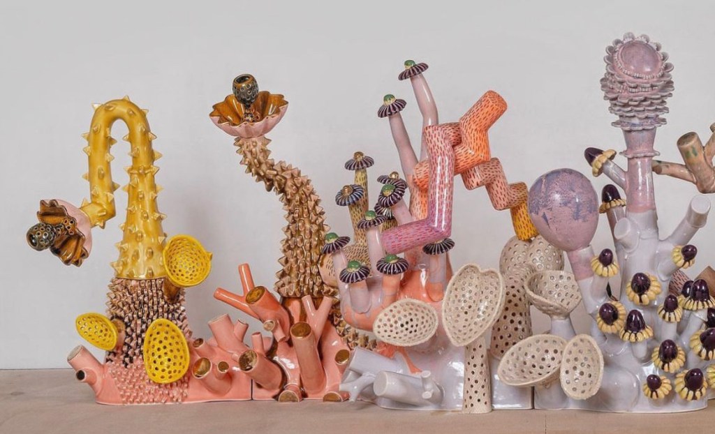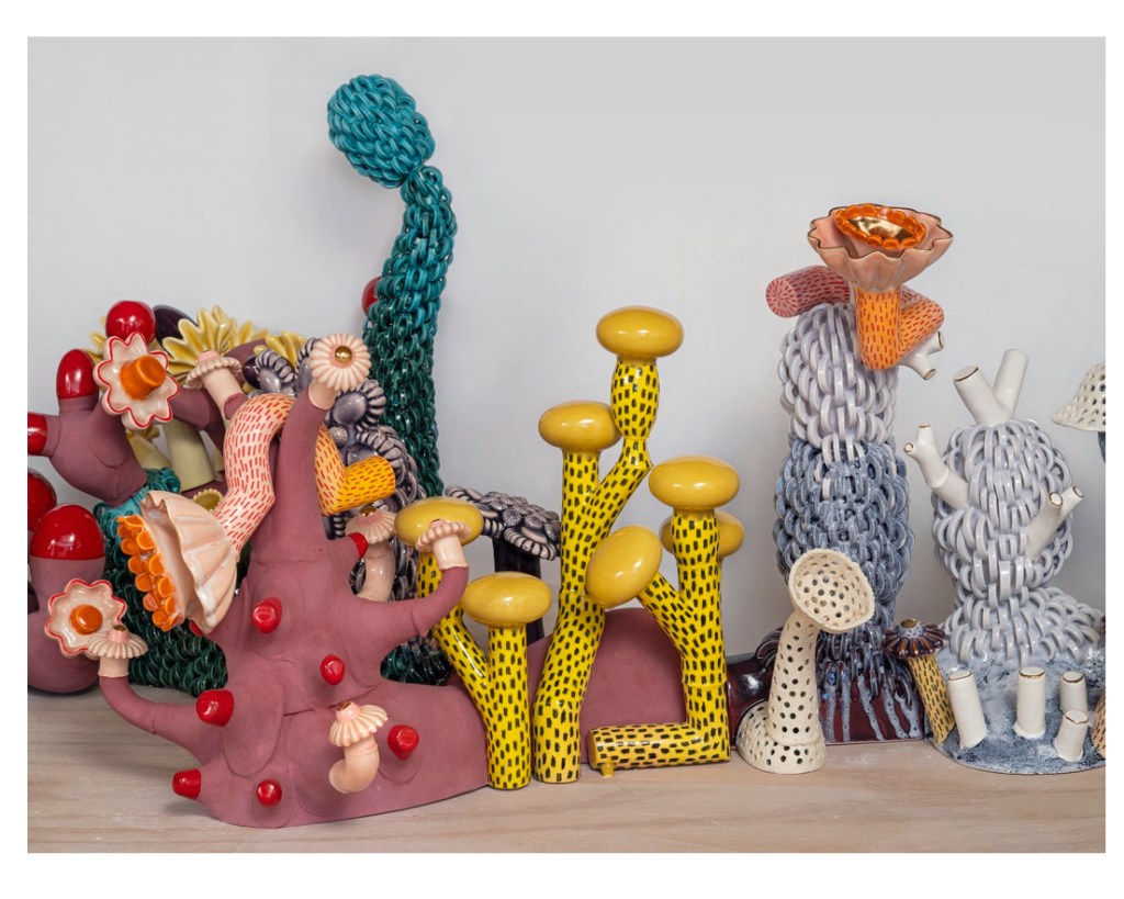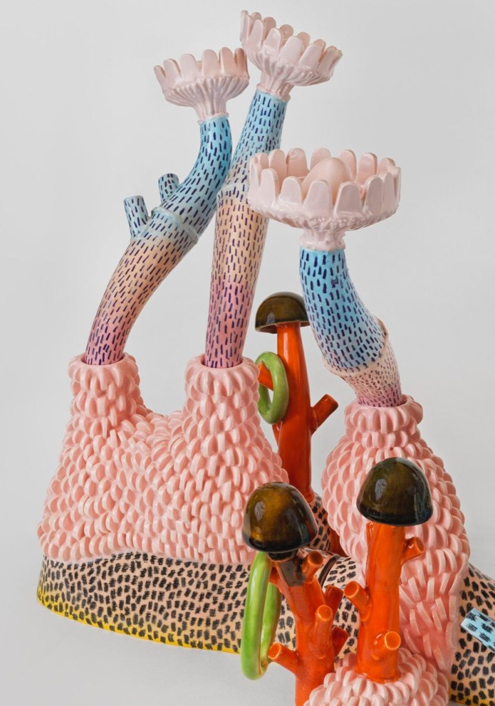 Based in Norwich, Vermont, Bogonovich recognizes nature’s immense capability for adaptation and strength in seemingly inhospitable spaces. “The whole dandelion growing out of a pavement crack thing,” she says. Her works embody transformation and abundant growth, and unusual colors, shapes, and textures arise in surreal combinations. With bulbous bases, spiked protrusions, and interlocked petals, the works imagine “the batty possibilities of what could be growing in the universe or what might be the first thing to sprout up after an environmental disaster.”