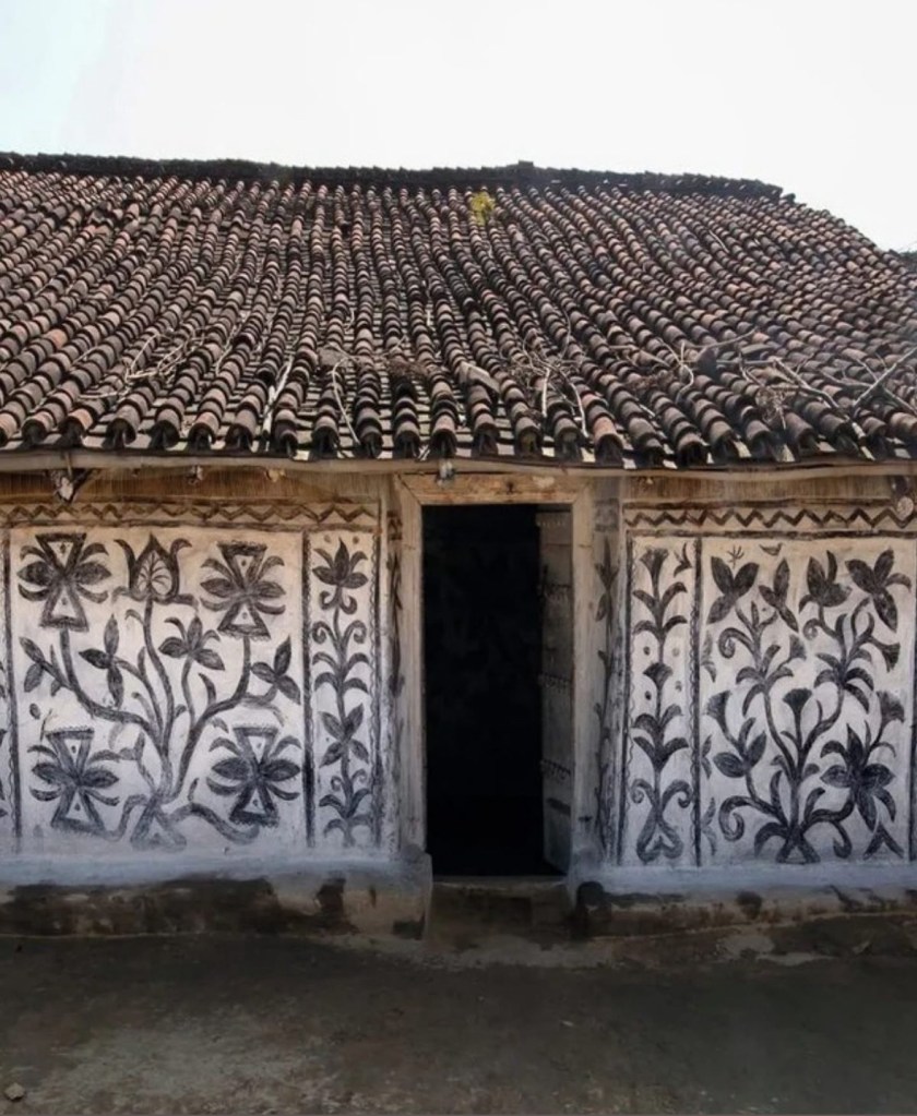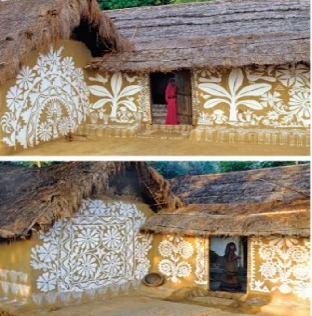In various parts of India, particularly in rural areas, mud huts are often painted with intricate and colorful designs. These murals, often found in tribal communities, are a form of traditional art that reflects cultural identity and beliefs. The materials used for the huts and the paintings are typically natural and locally sourced. The paintings are created using natural pigments derived from minerals, plants, and other organic materials.